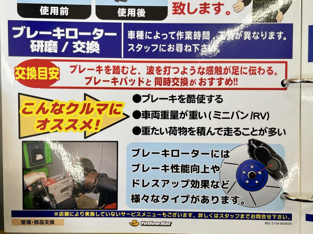 イエローハットではこのディスク研磨サービスを実施している店舗があり、交換を回避できれば1〜2万円程度費用を節約できる場合もあります。