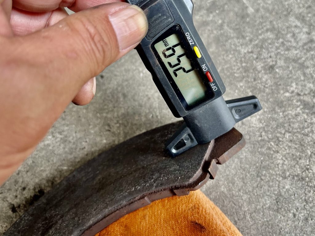 新品ブレーキパッドの厚さは概ね10〜12mm程度ですが、残り3mm前後になったら交換時期です。